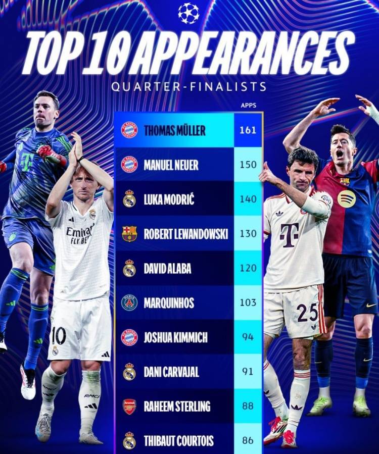 直播吧3月28日讯 本赛季欧冠8强已经全部诞生,分别为阿森纳、皇马、巴黎圣日耳曼、维拉、巴萨、多特、拜仁以及国米。欧足联官方统计了8强中出战欧冠比赛场次最多的球员top10,穆勒以161场居首,诺伊尔150场位居次席。